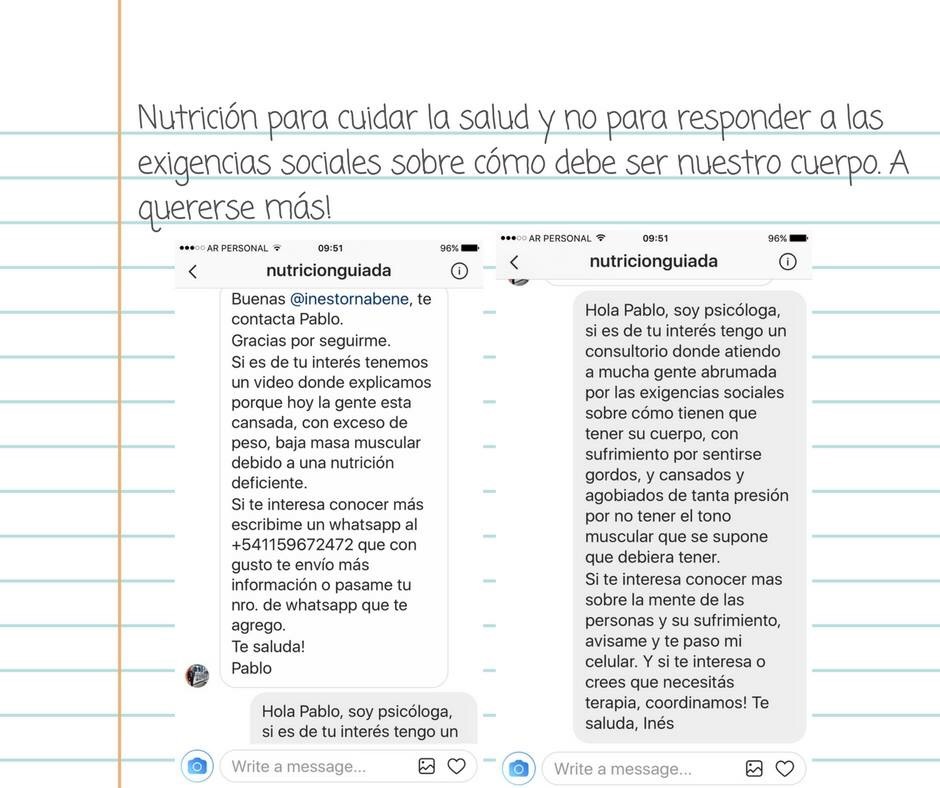 Me intereso en el tema Nutrición y soy voluntaria de la UBA en el programa Nutrición CBC+Vos que trabaja en temas sociales. Hoy recibí un mensaje por Instagram de un usuario que con el nombre «nutricionguiada» promociona suplementos dietarios. No se si quien me escribe es nutricionista o simplemente una persona haciendo marketing para vender productos. Pero automáticamente me acordé de muchos de mis pacientes y su padecimiento y malestar por no responder (y sentirse presionados a responder) a un standard de belleza y de delgadez y de tipo de cuerpo que nos impone la moda de la sociedad actual. La buena nutrición apunta a la salud del cuerpo, y eso incluye a la salud de la mente. La salud de la mente tiene que ver con desprenderse de determinados mandatos, como los que nos dicen que para ser exitosos tenemos que ser jóvenes, delgados, lindos y un millón de etc. Llevar una dieta saludable, hacer actividad física, descansar, hidratarse y tener momentos de diversión tiene que ver con cuidarse. Cuidarnos para sentirnos bien. Cuidarnos es querernos. Cuidarnos es prestar atención a las trampas que a cada rato nos tienden o que a cada rato nos dejamos tender.